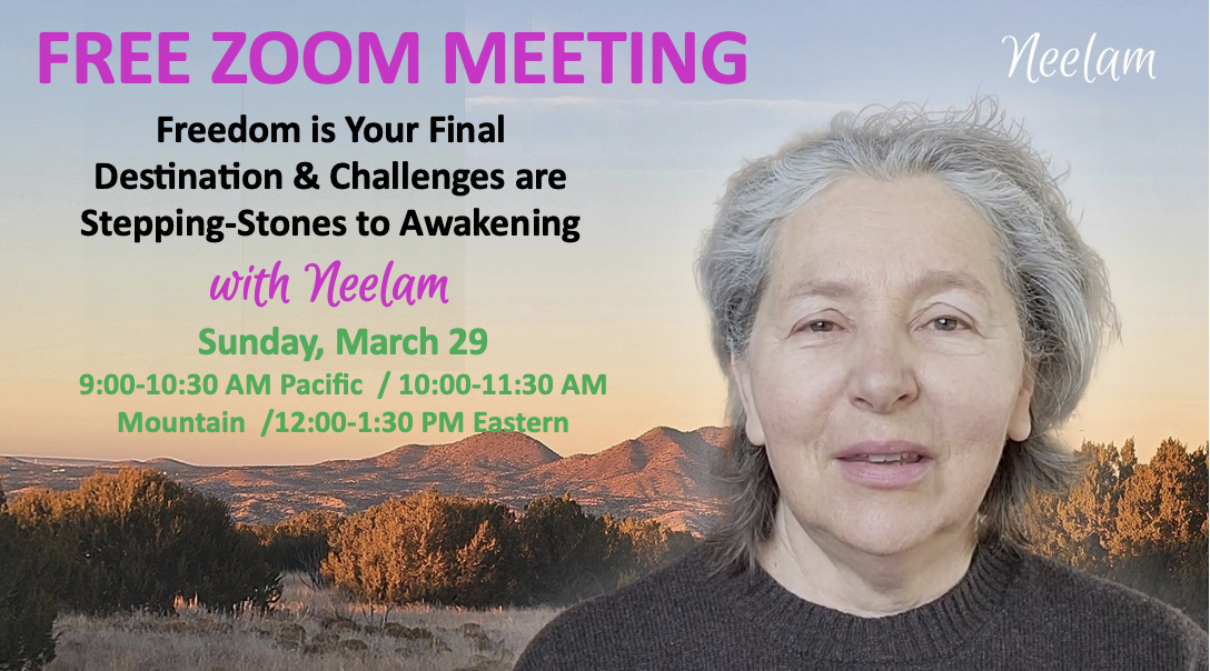 Spiritual Awakening, is a powerful shift from identifying oneself as the body /mind to knowing oneself as the spaciousness of our True Nature. As powerful of a shift as Awakening is, and as essential and necessary as it is, it is only the beginning – a small first step into reality and into coming to fully rest and live in Presence. Neelam makes a distinction between Awakening and Freedom – Freedom being a True Independence from the Patterns-of-the-Past. Before, during, and after Awakening the willingness to truly, tenderly, and openly Be Here and be Present to what arises leads us to True Embodiment of Presence and to Spiritual Freedom. There is no end to knowing ourselves as Presence, Love, and Emptiness and to knowing that in everything that arises.